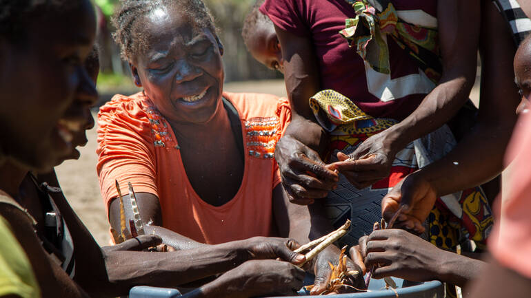 Dorothy Makina lacht gerne. Die 64-Jährige findet: Mit den anderen Frauen des Kaande Camps in der Westprovinz Sambias und ihren Familien geht die Arbeit leichter von der Hand.