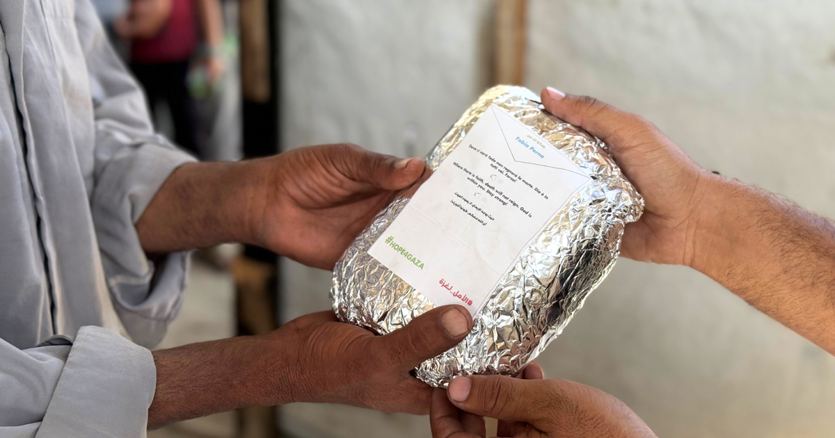 وعلى الرغم من ذلك كله، تمكّنا أخيرًا من تسليم بعض من رسائلكم شخصيًا خلال شهري نوفمبر وديسمبر 2025. حيث تمكنت فرقنا في غزة من طباعة أكثر من 1,000 رسالة ولصقها على وجبات ساخنة وُزِّعت على العائلات، وكان ذلك شهادة على ثبات الكلمات وقوة اللطف.